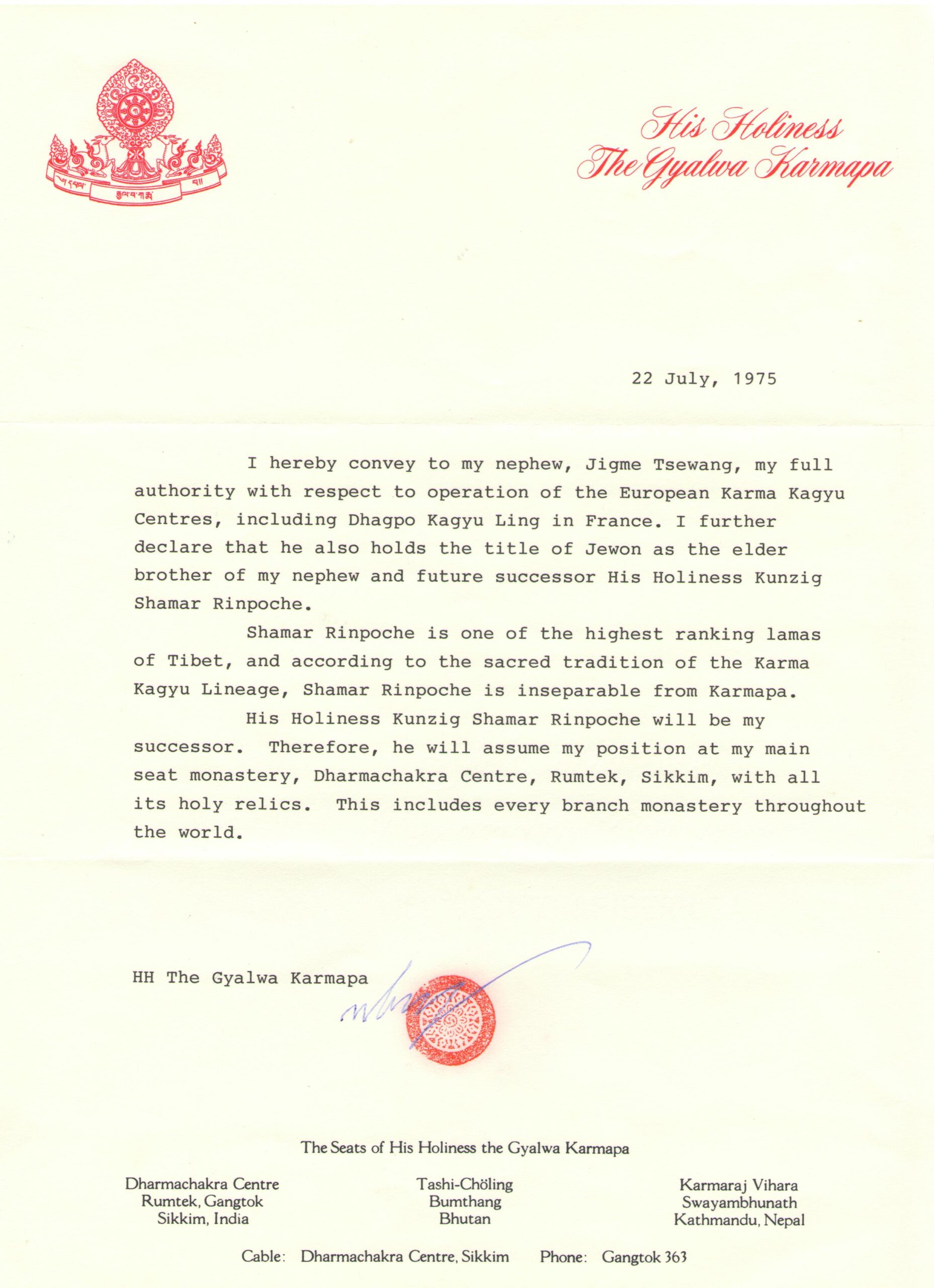 En 1977, dans une lettre écrite à la veille de son départ de France pour conclure sa tournée européenne, le XVIe Gyalwa Karmapa dit ceci :