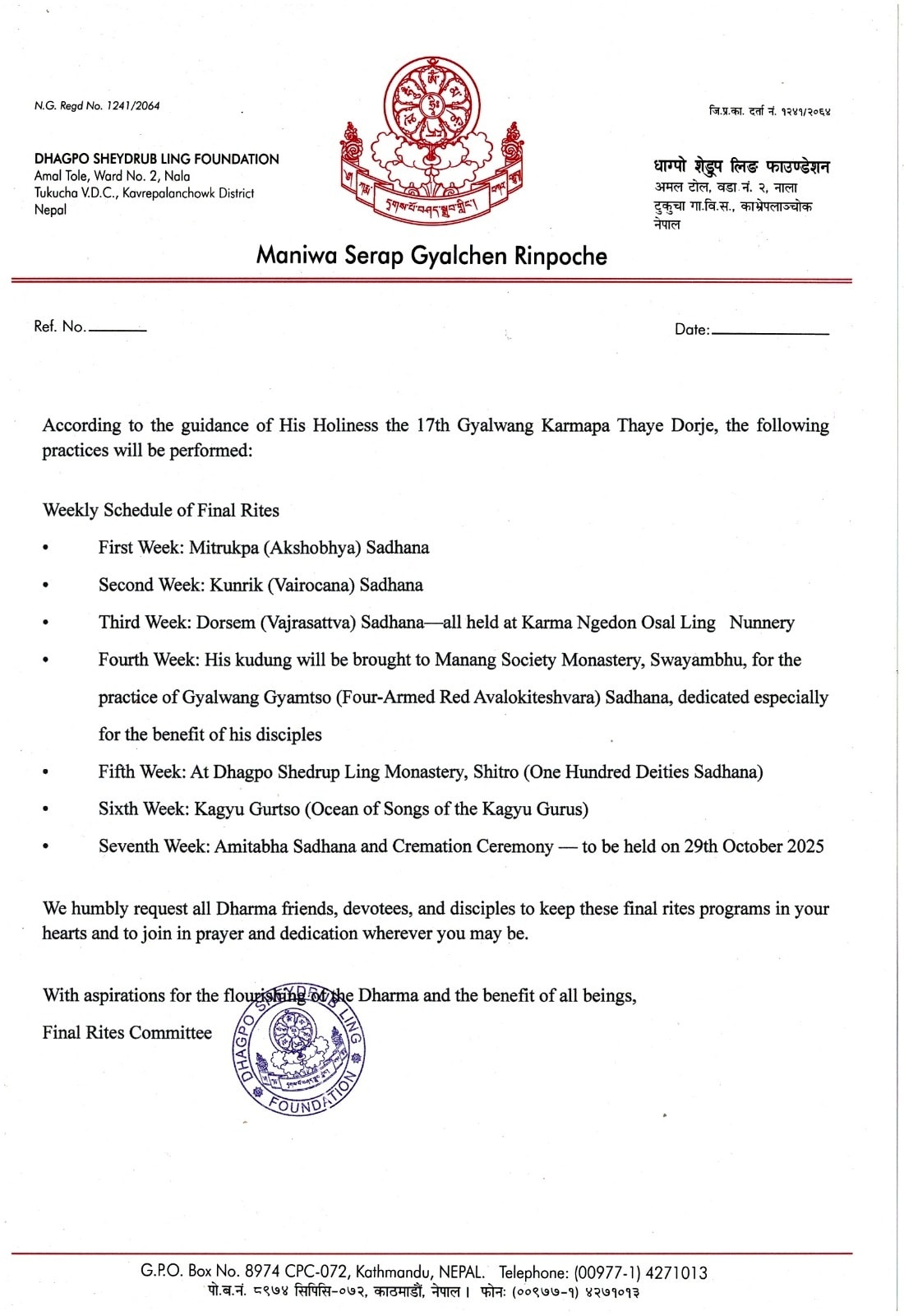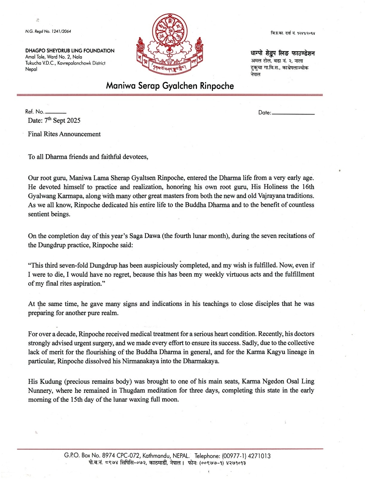 Wir bitten alle Dharma-Freunde, Anhänger und Studierenden demütig, diese letzten Rituale in ihren Herzen zu bewahren und sich, wo immer sie auch sein mögen, den Gebeten und Widmungen anzuschließen.