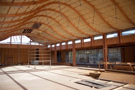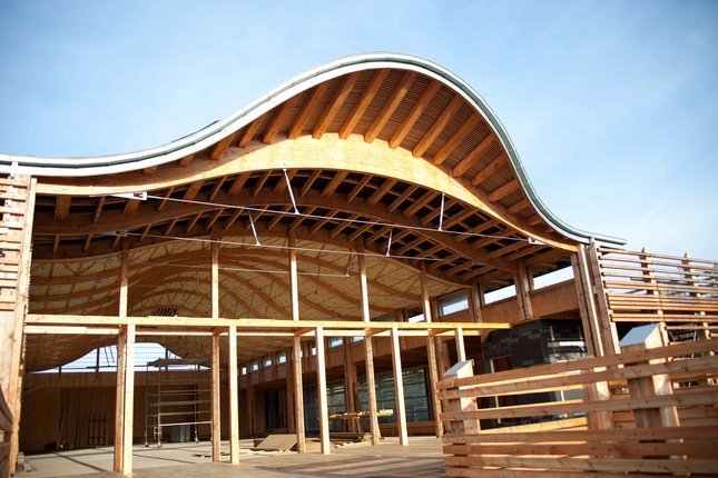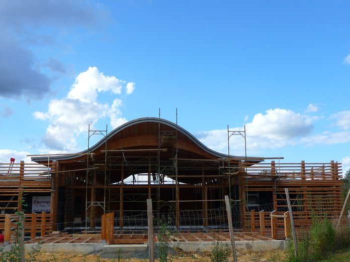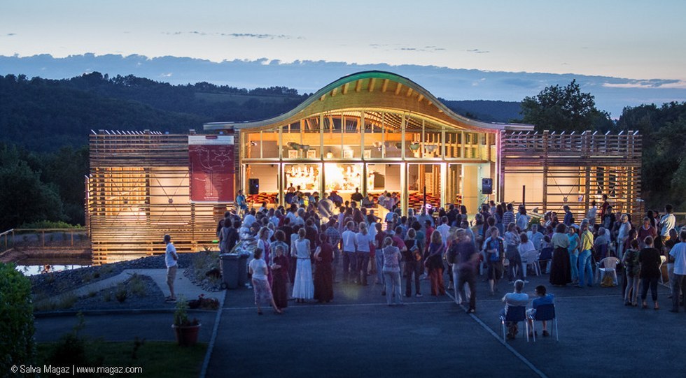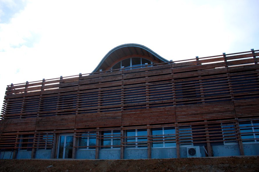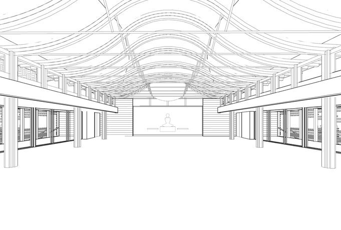 Los primeros bocetos se centran en un tejado con forma de ola, inspirado en las colinas redondeadas que llevan al barrio de le village de Chaban, más alto que Dhagpo. El revestimiento de madera recuerda a los hangares de tabaco de Périgord. Y después, el proyecto se desarrolla de manera colectiva.