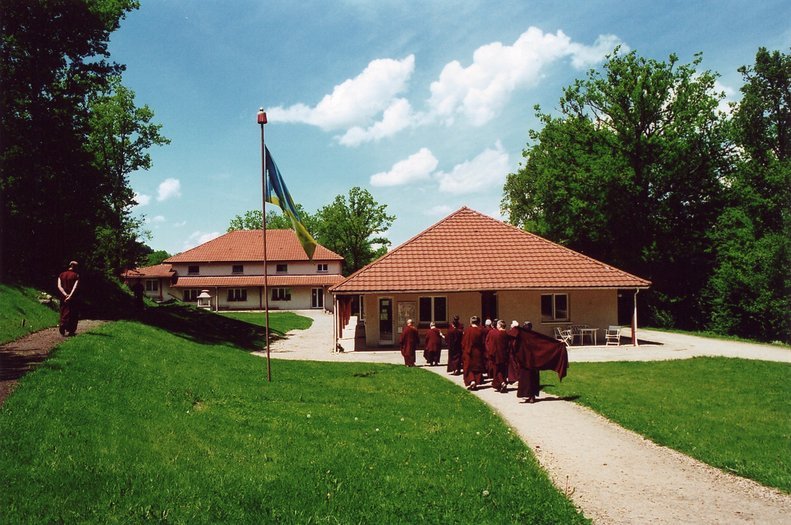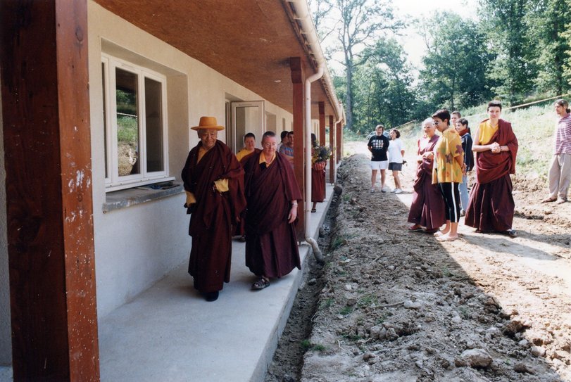 Claude vivió allí tres años hasta el inicio de su primer retiro en 1987. Firmó oficialmente la donación el 3 de abril de 1990. Mientras tanto, durante su retiro, un acuerdo intermedio permitió comenzar los trabajos alrededor de la casa original: se añadió un ala y se construyó un primer centro de retiro en la parte trasera. Los practicantes se alojaban en la casa. Guiados por Thierry C., que coordinaba toda la obra, residentes entusiastas, inspirados por Gendun Rimpoché y la perspectiva de realizar un retiro, se comprometieron en la construcción de los centros de retiro. Como explica Kemtcho, que ingresó en el primer retiro de tres años en 1987, Gendun Rimpoché no comenzó con la ambición de un gran proyecto de construcción para atraer a personas. El monasterio de mujeres, así como el de hombres, fueron construidos en respuesta a la petición hecha a Gendun Rimpoché por practicantes que deseaban comprometerse plenamente en la vía del Dharma.