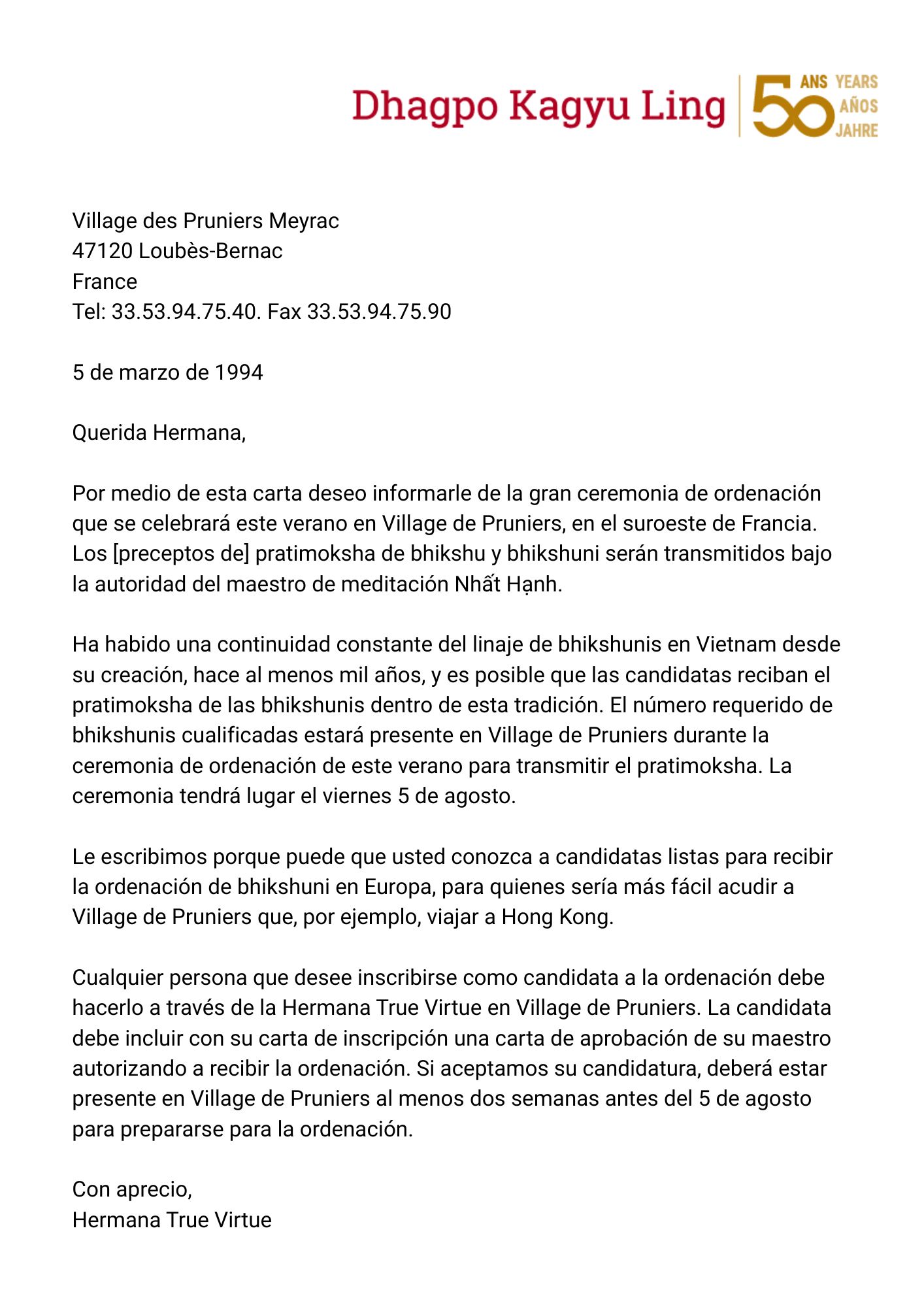 En una carta de Village des Pruniers fechada en marzo de 1994 se indica que «la orden de las bhikshunis se ha mantenido sin interrupción en Vietnam desde su creación hace al menos 1000 años, y que las candidatas pueden recibir el pratimoksha de bhikshuni en esta tradición». En la misma carta se pedía a cada candidata inscribirse con una carta de consentimiento de su maestro.