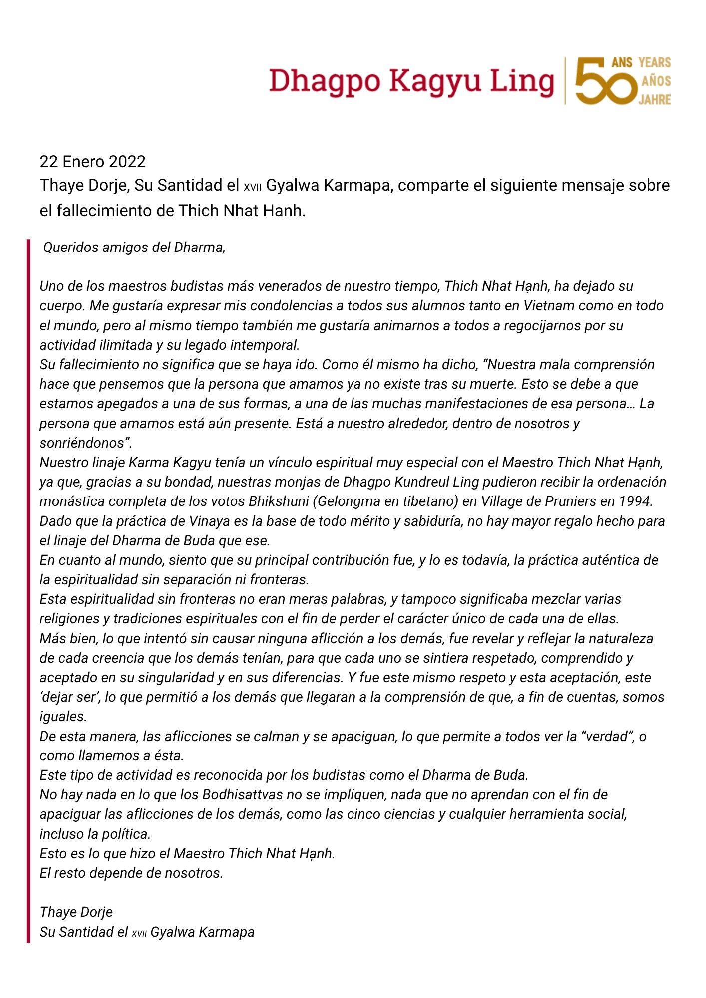 Nuestro linaje Karma Kagyu tenía un vínculo espiritual muy especial con el Maestro Thich Nhat Hạnh, ya que, gracias a su bondad, nuestras monjas de Dhagpo Kundreul Ling pudieron recibir la ordenación monástica completa de los votos Bhikshuni (Gelongma en tibetano) en Village de Pruniers en 1994.