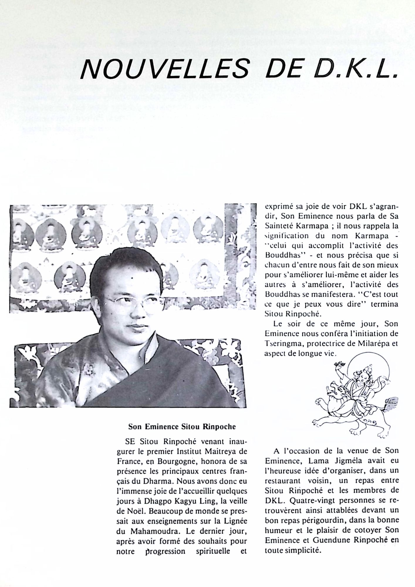 Tai Situ Rimpoché regresó de nuevo a Dhagpo Kagyu Ling en julio de 1986 para enseñar sobre “La visión, la meditación y la acción del Mahamudra”, y luego en diciembre de 1987, cuando confirió la iniciación de Tseringma, protectora de Milarepa y aspecto de larga vida.