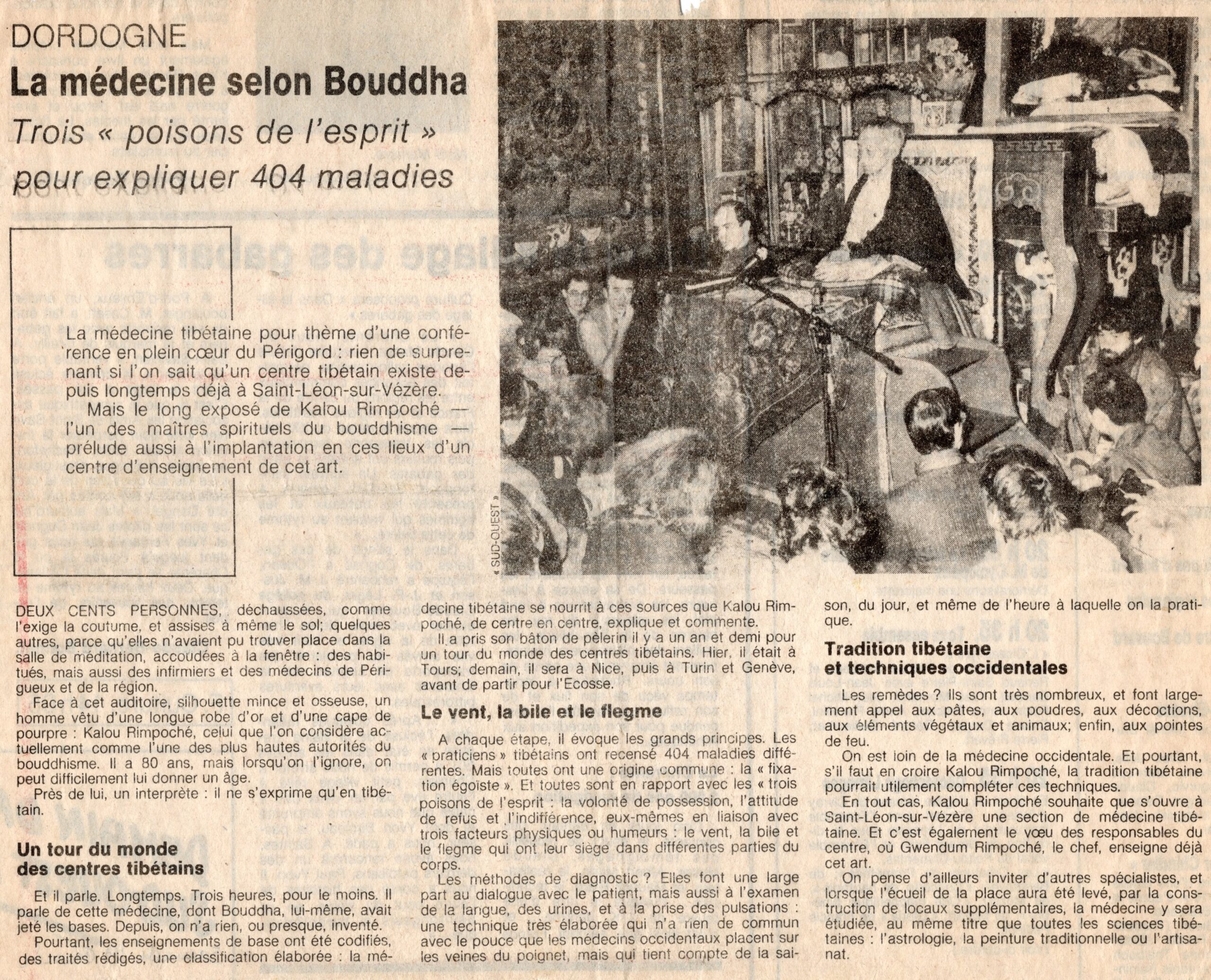 En Dhagpo Kagyu Ling, en octubre de 1980, la asistencia era tal que el templo no podía albergar a todos. Por suerte, el clima fue benévolo y la enseñanza de Rimpoché se dio en el patio. Se levantó un trono bajo el cobertizo, se extendieron rápidamente plásticos en el suelo y la gente presente se sentó sobre cojines.