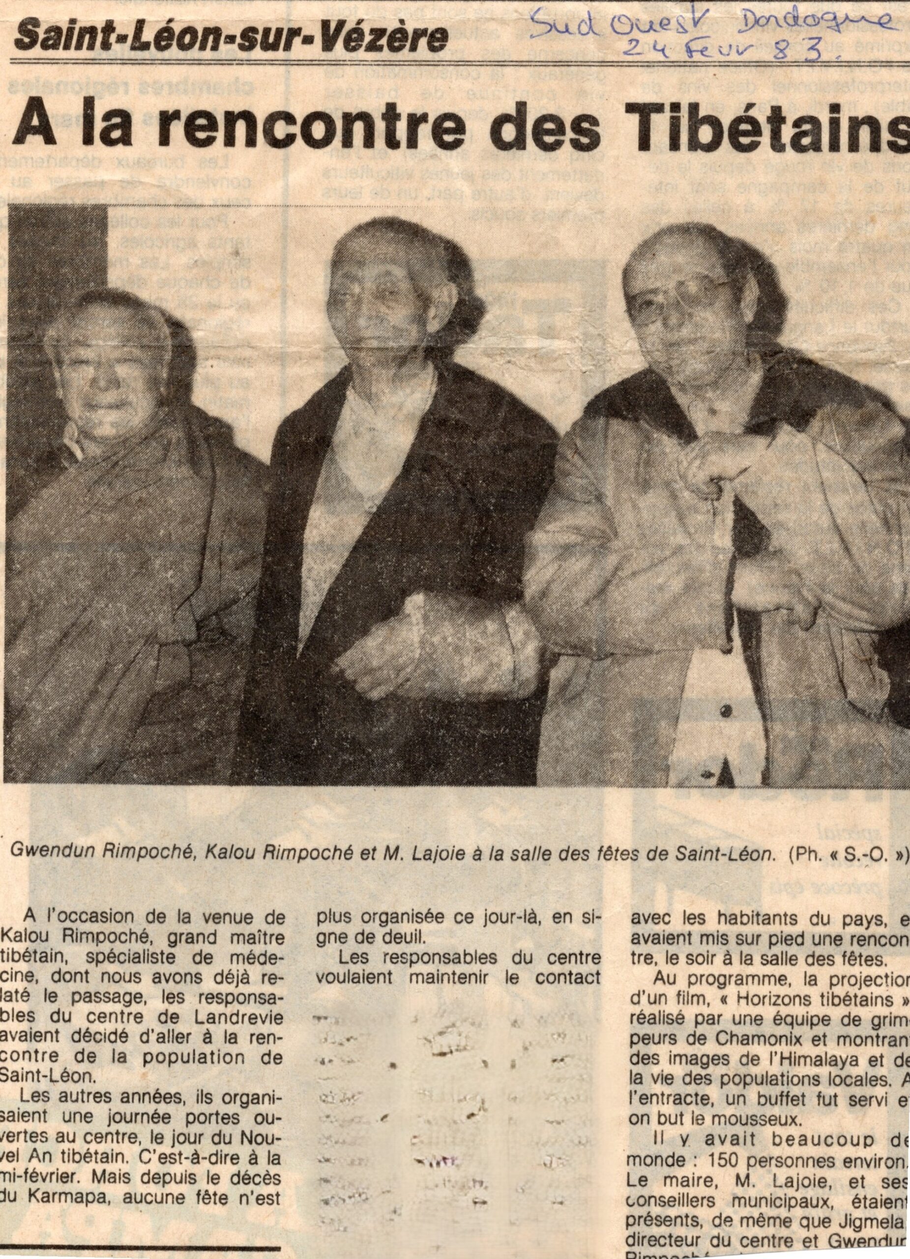 Posteriormente, a pesar de su avanzada edad, Kalu Rimpoché regresó en numerosas ocasiones a Dhagpo. El 19 de febrero de 1983 enseñó sobre medicina tibetana, explicando el origen de las enfermedades según las enseñanzas del Buda, su modo de curación y la relación entre medicina y espiritualidad. Este compartir fue particularmente valioso, dado que Rimpoché había estudiado con su padre, médico y practicante de tantras. Durante esta visita, confirió la iniciación de Chenresi de mil brazos. También tuvo contacto con la población local participando en una velada en la sala de fiestas de Saint-Léon-sur-Vézère, en presencia de Gendun Rinpoché, Jigme Rinpoché, el alcalde de la época y los concejales.