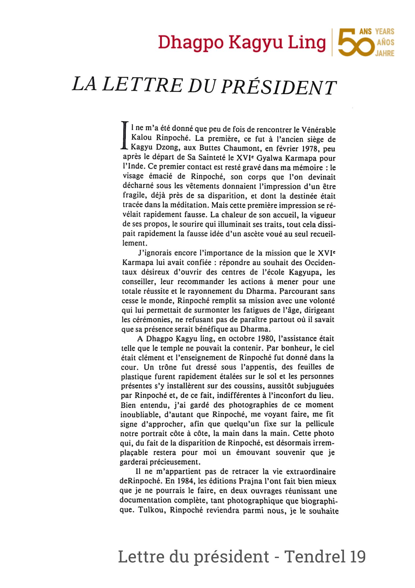 Por su realización, su devoción hacia el XVI Gyalwa Karmapa y su infatigable voluntad de compartir el camino del Buda, Kalu Rimpoché desempeñó un papel destacado en la introducción del budismo en Occidente, dejando su huella en Dhagpo Kagyu Ling y en todas las sanghas establecidas en la Côte de Jor.