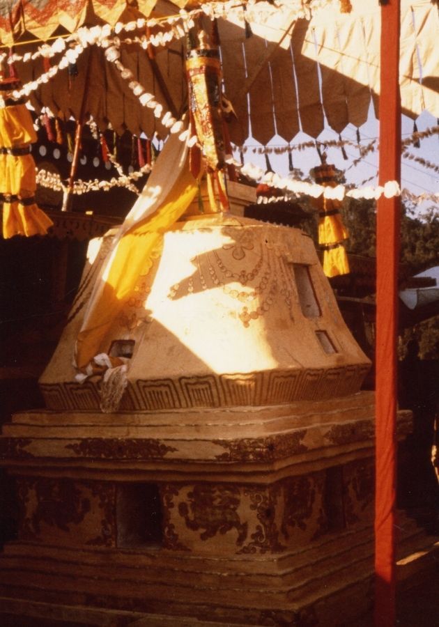 Cada semana abríamos el relicario, retirábamos la sal, lavábamos el cuerpo, lo secábamos y lo colocábamos de nuevo en el relicario con nuevas sales de embalsamamiento. Puedo dar fe de que nunca hubo el menor olor desagradable; ¡al contrario, el olor era siempre muy agradable! No había ningún signo de descomposición. Además, el cuerpo no tomaba la apariencia de un cadáver: permanecía flexible, como el de una persona viva. Cuando un maestro eminente fallece, se acostumbra a colocar el cuerpo en la postura completa de meditación, con las piernas cruzadas, y a poner en sus manos objetos rituales como una campana y un dorje, y estas manipulaciones podían realizarse con mucha facilidad. El cuerpo embalsamado en sal era luego colocado en un relicario de madera que se depositaba sobre un mandala.