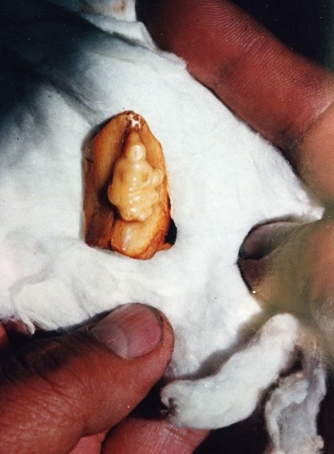 Cuando volvimos a abrir la estupa, descubrimos que la mayor parte de los huesos no se habían quemado. En el cráneo encontramos reliquias del cerebro, pero este había tomado la forma de un huevo esférico y tenía un color dorado brillante. Su Santidad Dilgo Khyentse Rimpoché lo vio y explicó que se trataba de una reliquia especial, uno de los signos que prueban que una persona ha alcanzado el estado de buda. Después fue conservada en la estupa del monasterio de Rumtek.