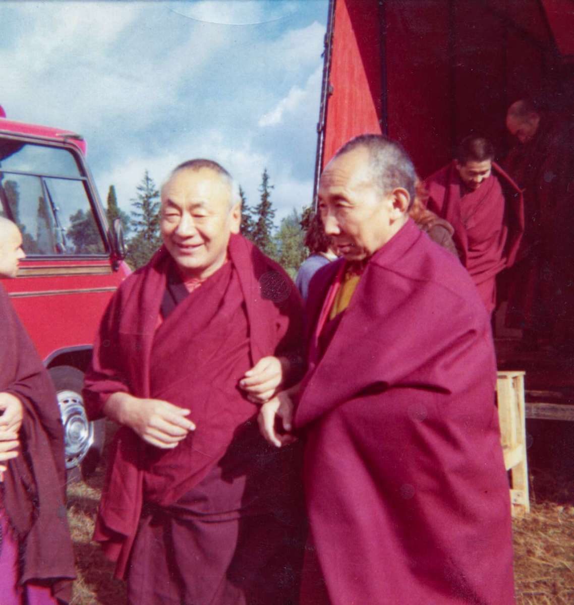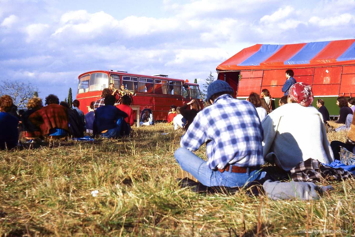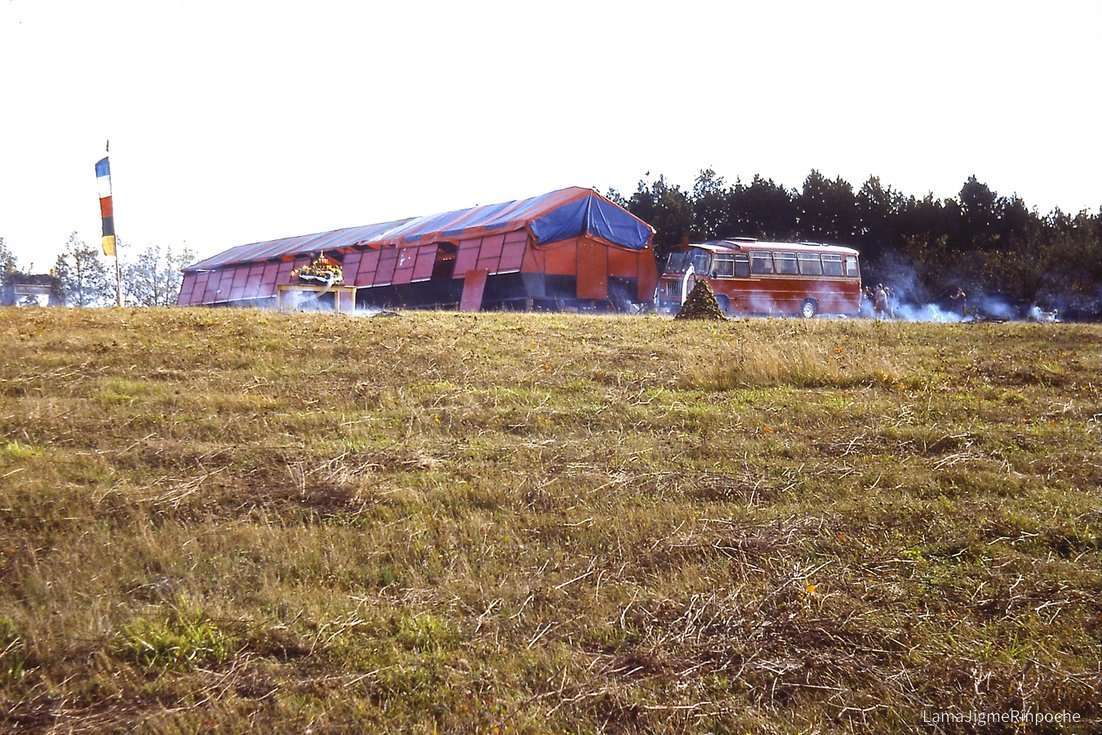 Gyalwa Karmapa recorre Europa en un autobús rojo acondicionado por sus primeros estudiantes. La mitad de los asientos fueron retirados y reemplazados por sillones para Karmapa y su séquito. En el lateral del vehículo, pintadas con plantilla, se leían las palabras Karma Kagyu Trust, nombre del primer trust establecido en Europa por el linaje karma kagyü; y en el capó podía leerse la siguiente aspiración: