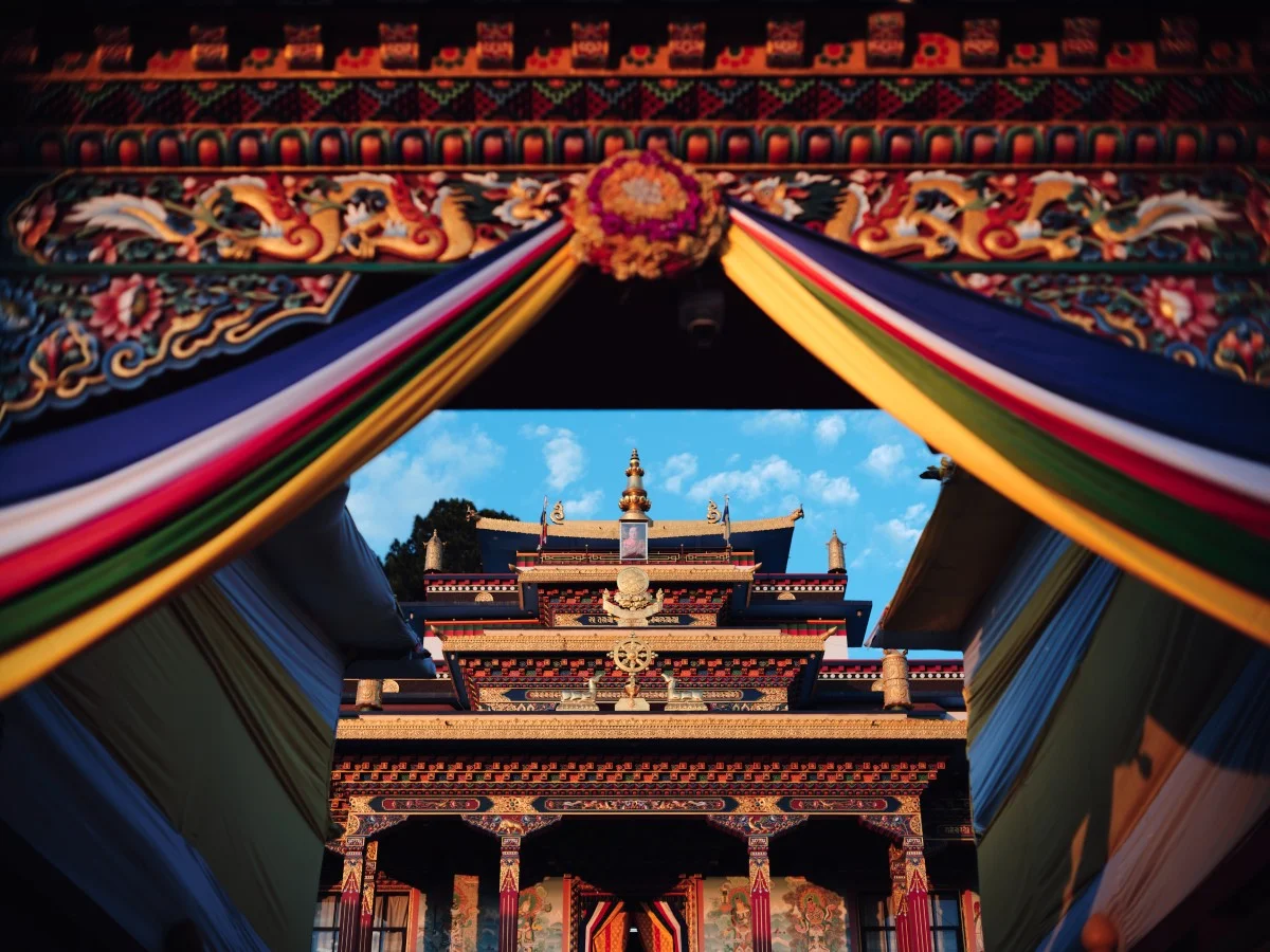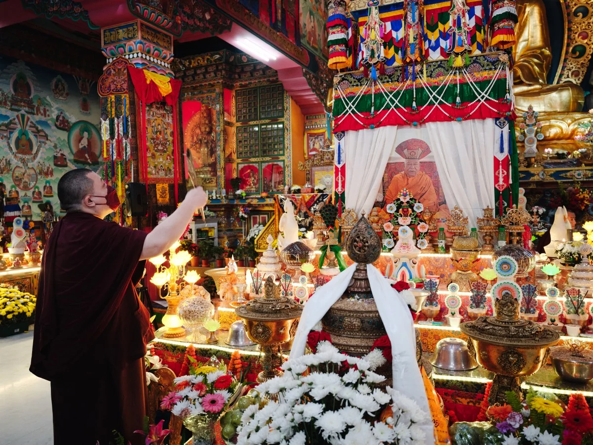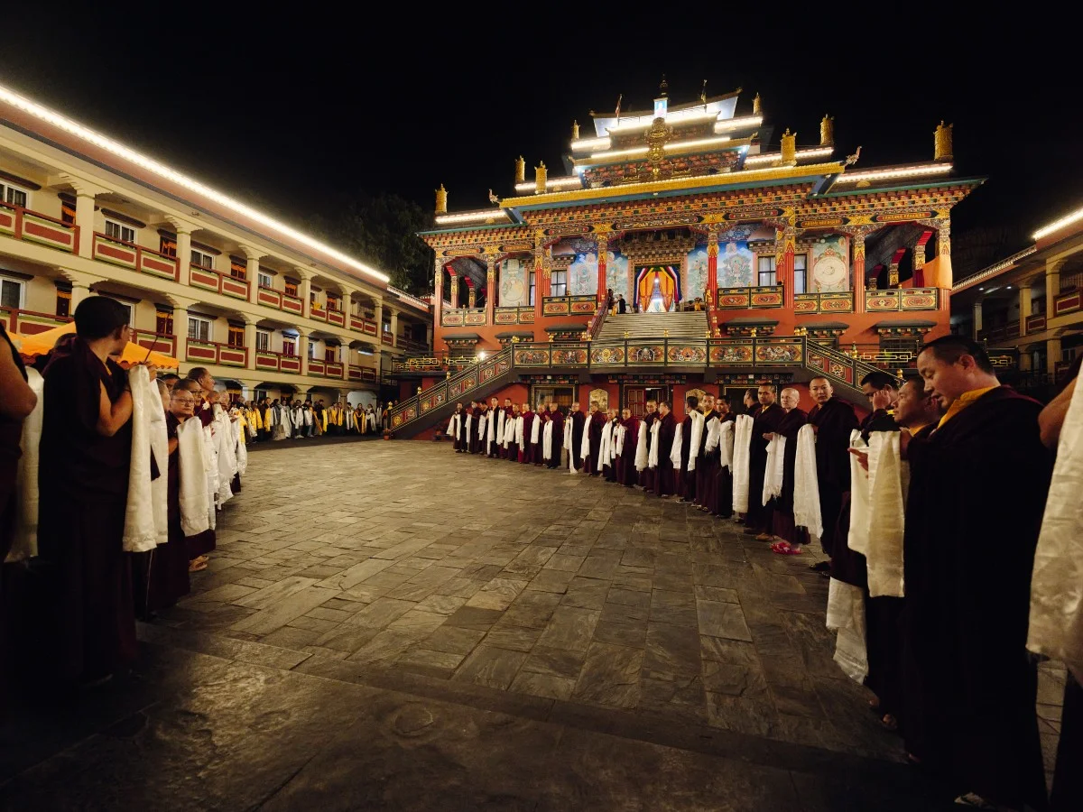 Le cortège s’est ensuite rendu directement au monastère de Dhagpo Sheydrub Ling, où les rituels du mahaparinirvana en l’honneur du très vénéré Maniwa Sherab Gyaltsen Rinpoché – ou plus simplement « Lama Rinpoché » – étaient continuellement accomplis depuis l’arrivée du kudung (Wylie : sku gdung, en anglais : « corps sacré ») dans son siège principal il y a plusieurs semaines.